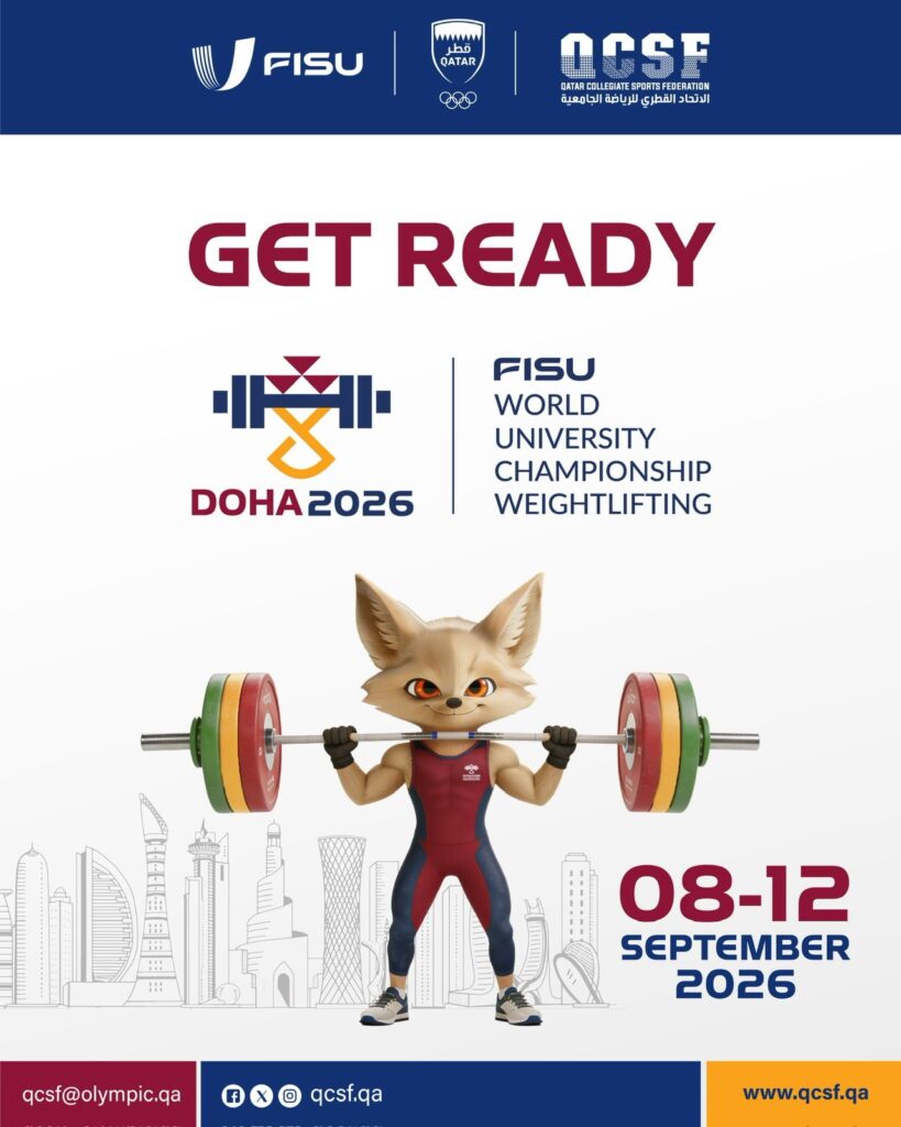 We are proud to unveil the official logo of the 2026 FISU World University Championship in Weightlifting, taking place from 8–12 September 2026 in Doha, hosted by the Qatar Collegiate Sports Federation.