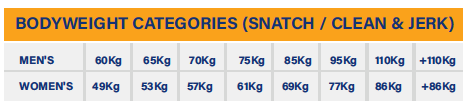 The competitions will include the following bodyweight categories: